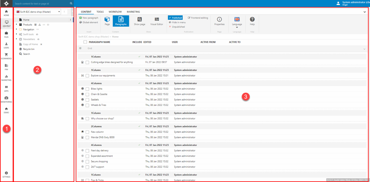 • A tree (2) which is used to structure and navigate between pages, folders, and tools like content search the recycle bin