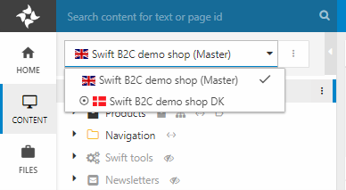 The content tree is a little bit different from other area trees, however, since it allows you to switch between different websites and language layers using the website selector (Figure 1.2).