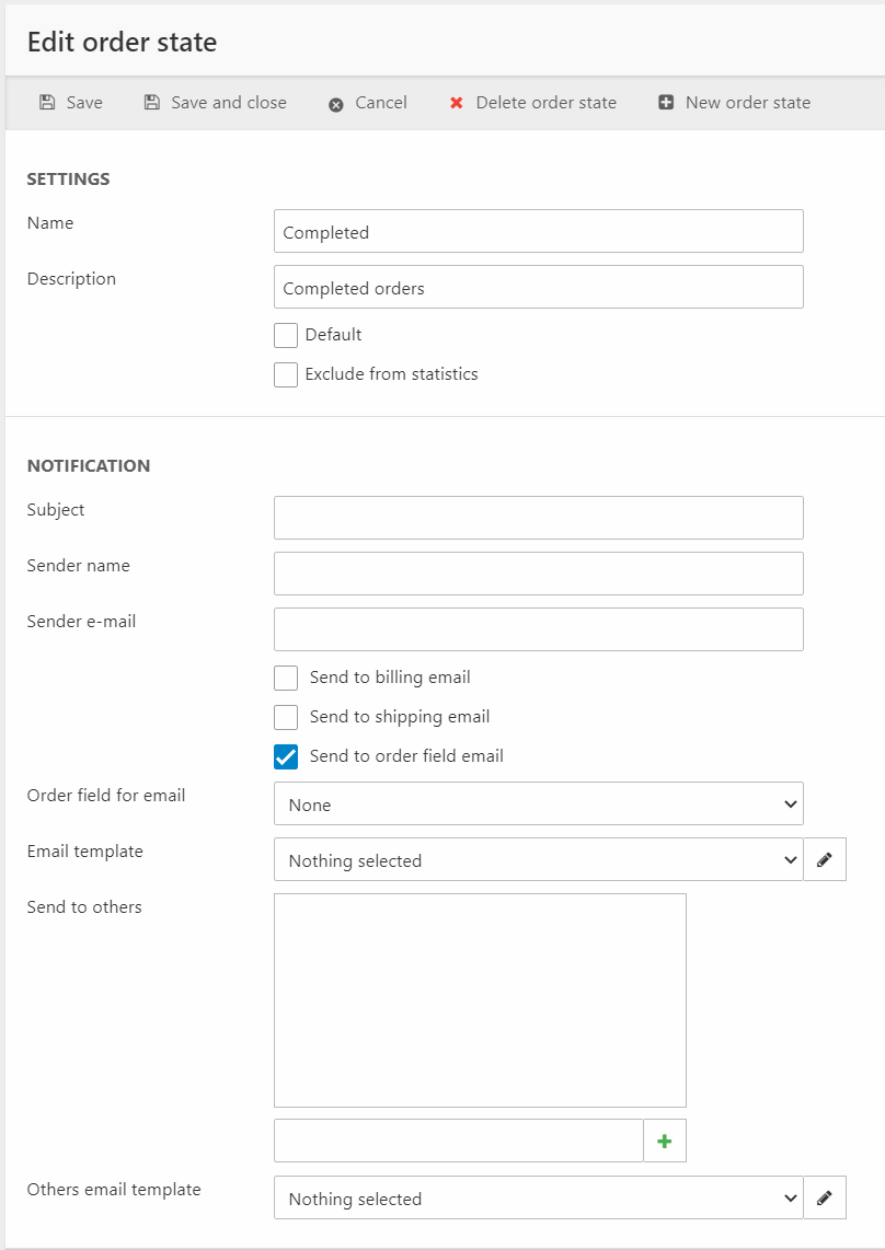 You can also manually add emails to the Send to others field – and select an email template to use for this email. This field is typically used to contact key people inside the organization when an order is set to a specific state, whereas the other notifications are typically used to notify the customer.