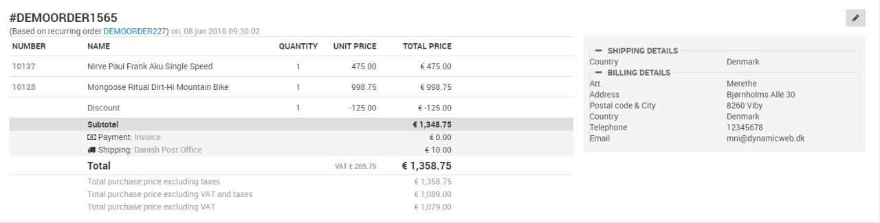 - The order subtotal, total, and totals excluding VAT & Taxes