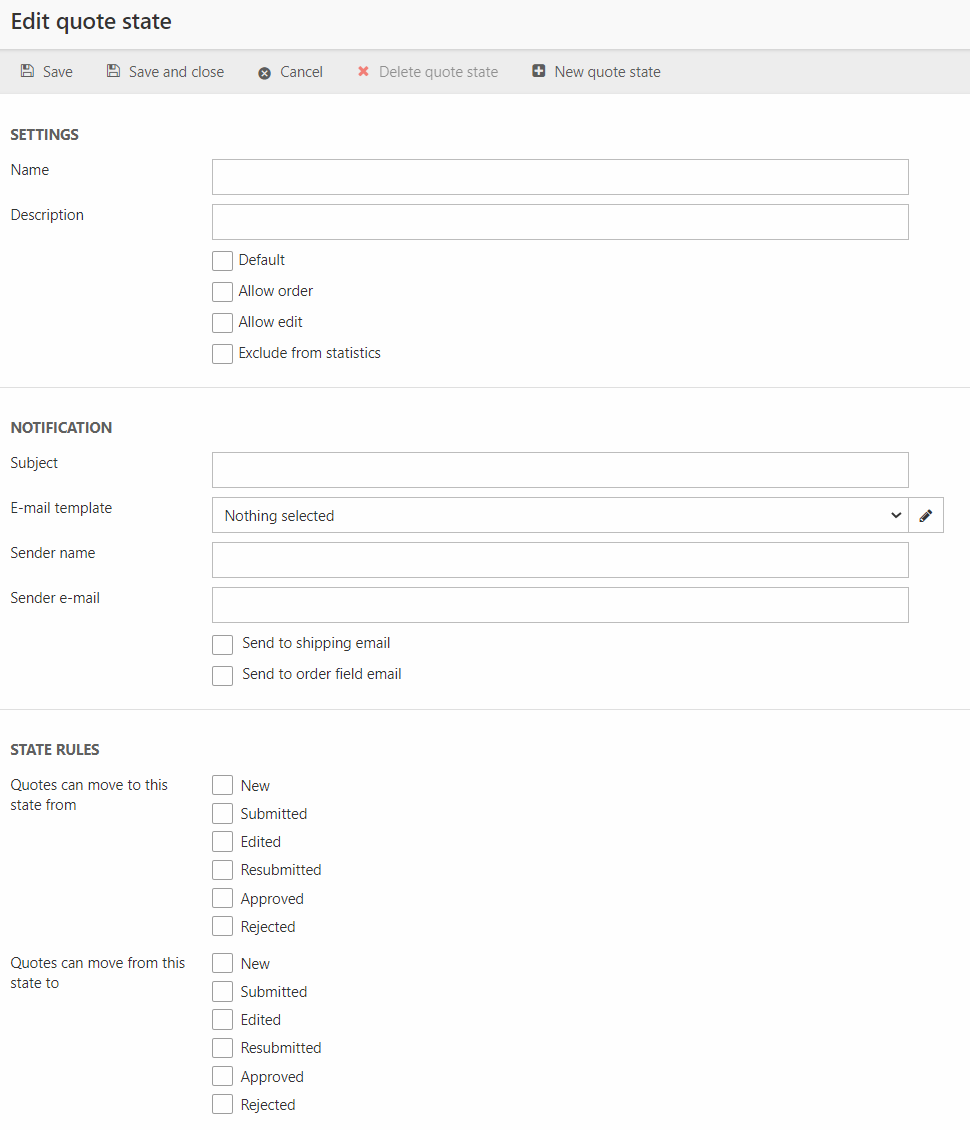 From the settings area you should provide a name and description (optional) for the quote state, and then configure the quote state behavior: