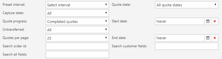 - Filter on quote state (custom work-flow states), quote progress (system controlled) or capture state (depending on payment provider details)