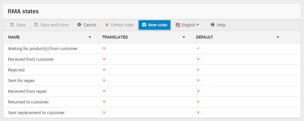 RMA states are custom states for controlling your RMA process. A Dynamicweb solution is born with a number of default states, such as ‘Waiting for product(s) from customer’, ‘Rejected’ and ‘Sent for repair’ – but you can easily create new RMA states