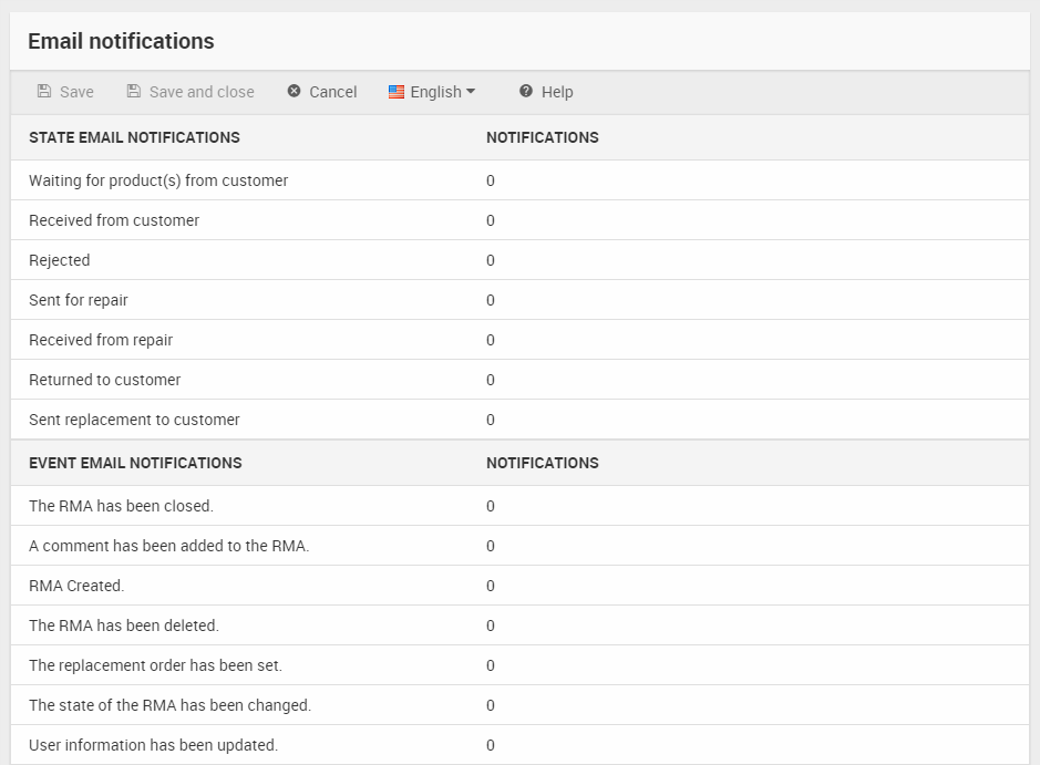 To configure RMA email notifications, go to Settings > Ecommerce > RMAs > Email configuration and open the email notification view (Figure 9.1).