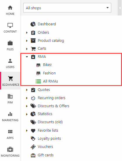 - Click a shop to open the RMA list for that shop only - or All RMAs to see all RMAa created on the solution