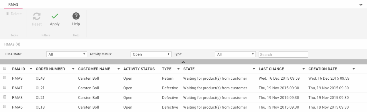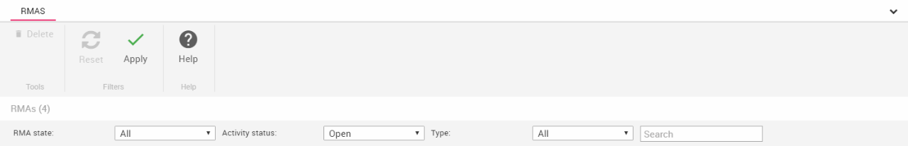 You can use the RMA List toolbar (Figure 4.1) to filter or search the RMAs: