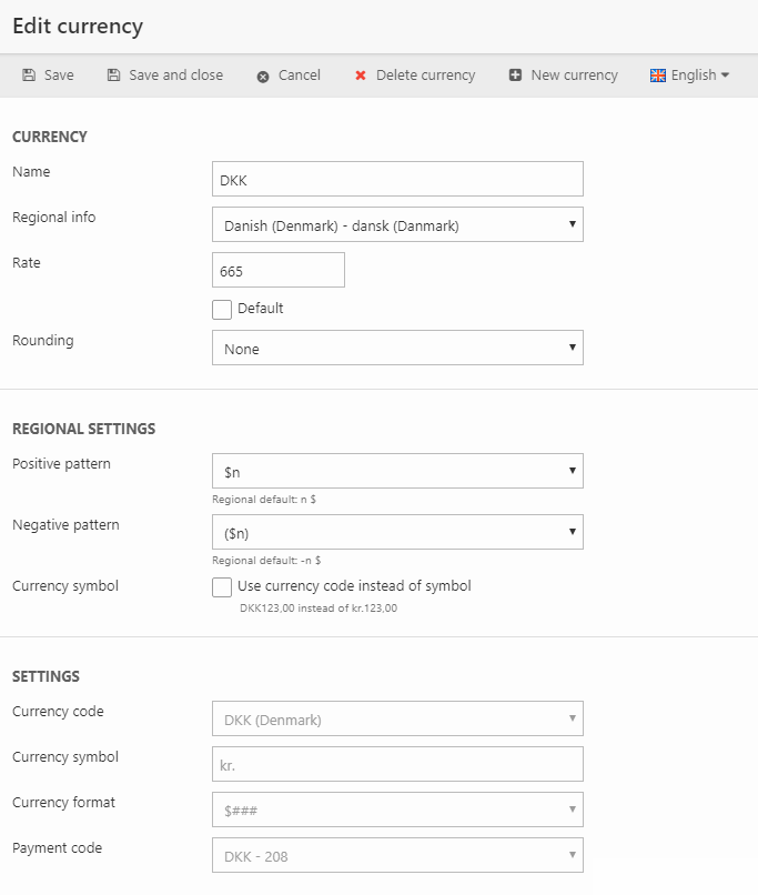If you selected a region from the regional settings dropdown, you have access to the regional settings. With these you can customize how positive and negative amounts are rendered – or use the default pattern. You can also choose to show the currency code instead of the symbol.