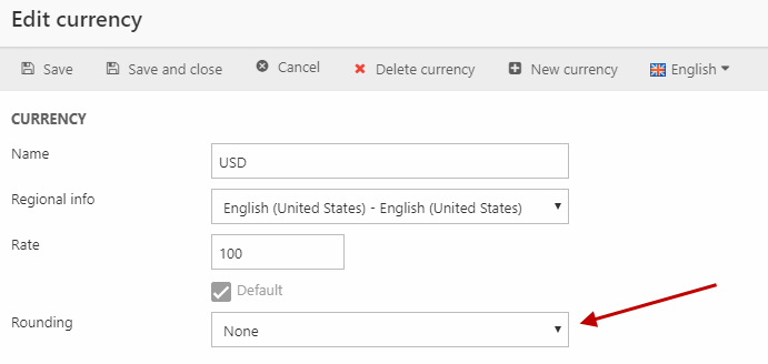 - Select a rounding method for prices in the selected currency – if none are available, you must create them. Read more below.