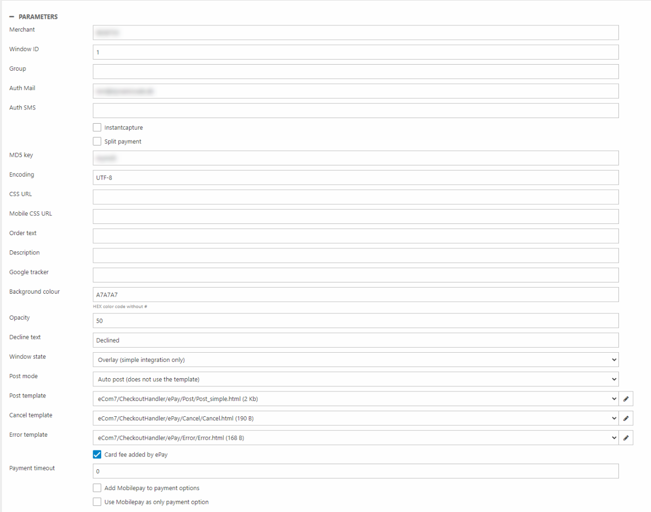 One set of parameters is used to connect to the Bambora Payment Window account and configure basic behavior: