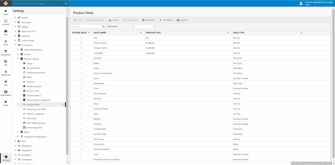 Contains product field definitions from Settings -> Ecom -> Product catalog -> Product Fields.