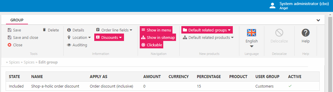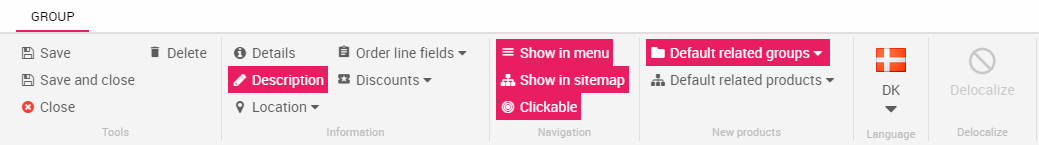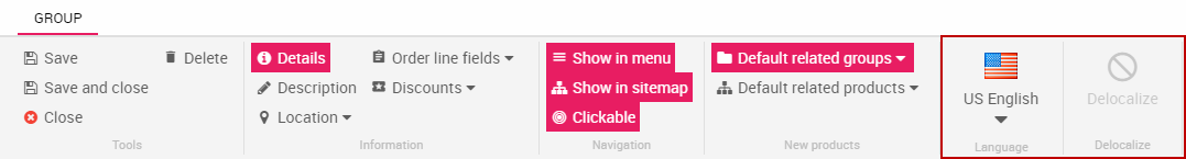 The Language and Delocalize buttons (Figure 13.1) enable you to localize and delocalize a product group, which makes it possible to use the same set of product groups across multiple Ecommerce languages.