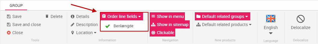 The order line fields button (Figure 9.1) lets you assign order line fields to products in this group. Order line fields allow customers to add additional information to an order during checkout, e.g. how many meters of rope or wire they want to order.