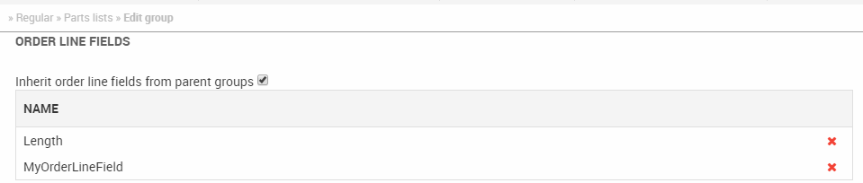Use the dropdown to add fields – and the list view to remove them (Figure 9.2). Non-inherited order line fields are removed using the red cross, whereas inherited fields must be removed on the parent group (or inheritance turned off).