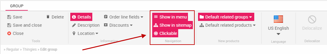 With the navigation options, you can control whether a product group should appear in the menu, in the sitemap, and if it should be clickable.