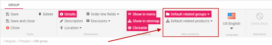 - View or add default related groups – products created within this group are then automatically added to all the related groups
