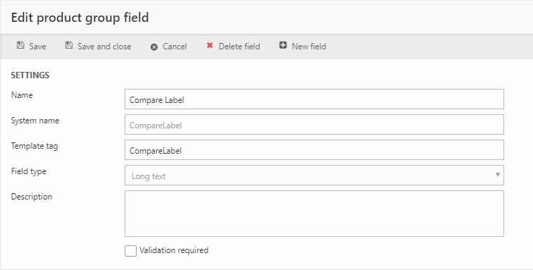 - Provide a template tag-value for the field. Use this value in your templates to render the field content on the frontend. Read more about template tags for product groups below.