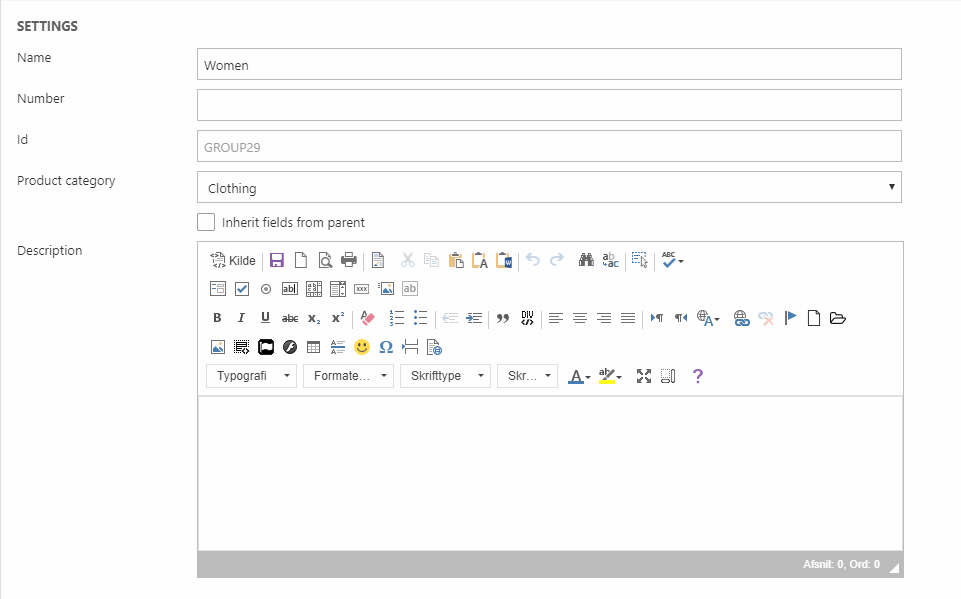 - Select a product category – all fields in the product category will then be added to products in this group – and/or check inherit fields from parent to inherit all product category fields from the parent group.