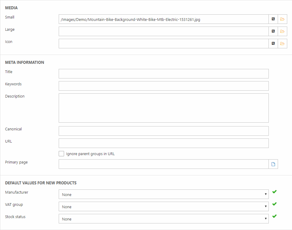 - Use the Default values for new products to, well, set default values for new products created in this group. You can set a default Manufacturer, VAT group, and/or Stock state. You can force the default value onto existing products by using the green checkmark. This has to be done separately for each Ecommerce language.