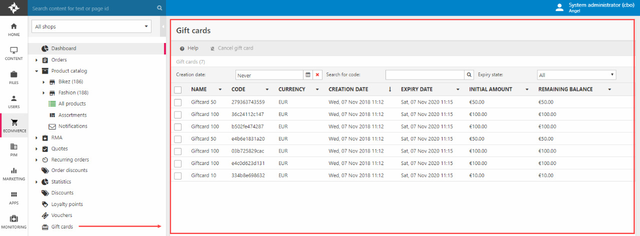 Whenever a gift card is sold and a gift card code is generated, it is added to the Gift cards list in Ecommerce (Figure 9.1). You cannot generate gift cards manually – they must be generated by a sale from frontend.