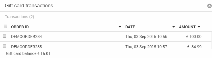 You can select any number of gift cards and click cancel gift card – this sets the expiration date to ’now’. You can also click a gift card to see a list of transactions where the gift card was used (Figure 9.2).