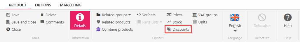 The discounts button (Figure 12.1) allows you to manage a product's discount settings, including options to include or exclude the product from specific order discounts.