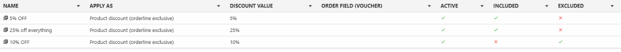 To use a discount and have it appear in this list, make sure that both the 'Assignable from product catalog' and 'Active' checkboxes are selected in the product discounts.