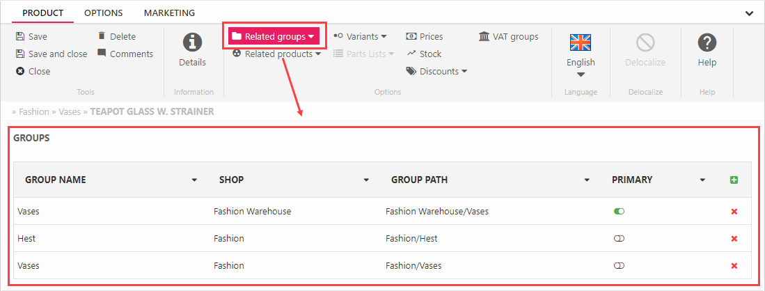 Products can belong to one or more product groups. If a product belongs to more than one product group it's a good idea to set one of the groups as the primary group, the one used to generate a unique URL to the product in frontend. This can be done via either the related groups tool or via the context menu on a product list in PIM or Ecommerce.