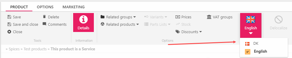 When more than one language is present on a solution you can use the language selector dropdown (Figure 10.1) in the ribbon bar to change the language context.
