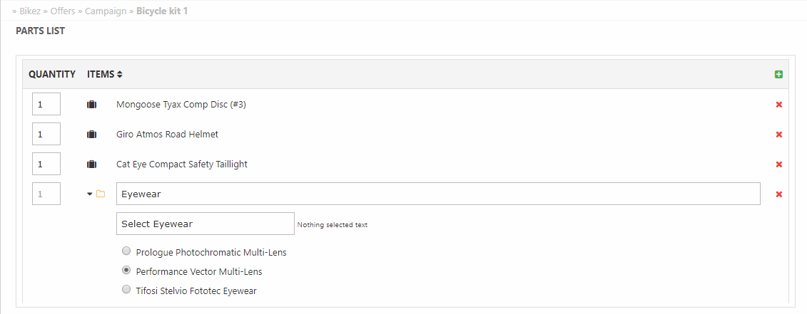 If a product group is selected the quantity indicates how many products from this group can be included in the parts list. You can preselect a default option using the radio buttons, and also write a nothing selected text (e.g. Select your helmet here).