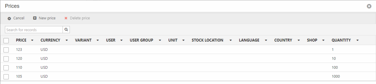 Contains price matrix data for products as defined in prices section of backend product details. Product is identified by combining PriceProductId, PriceProductVariantID and PriceProductLanguageID.