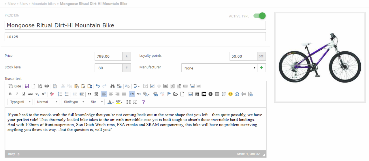 If the solution architecture supports doing this directly in Ecommerce (instead of e.g. Dynamicweb PIM or a remote system), this can be done simply by clicking a product in the product list and changing product field values (Figure 4.1).