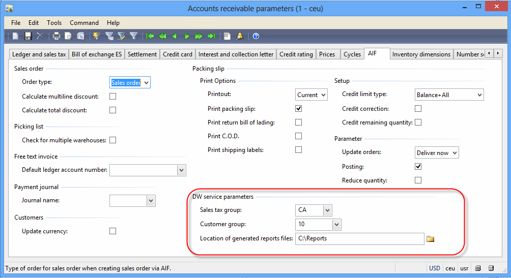 - Go to Account receivable > Setup > Parameters > AIF Tab. Set the default values for the “Sales tax group”, “Customer group” and a path to the temporary location for generated PDF reports in the corresponding fields (Figure 2.3).