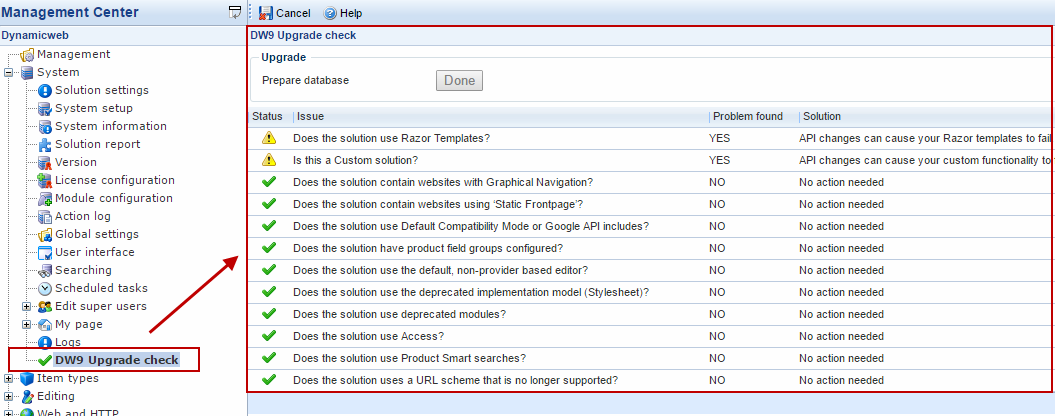 Once you've upgraded to Dynamicweb 8.8.1.12 - which is a prerequisite for upgrading to Dynamicweb 9 - you will have access to a DW9 Upgrade Check node located at Management Center > System > DW9 Upgrade check (Figure 1.2).