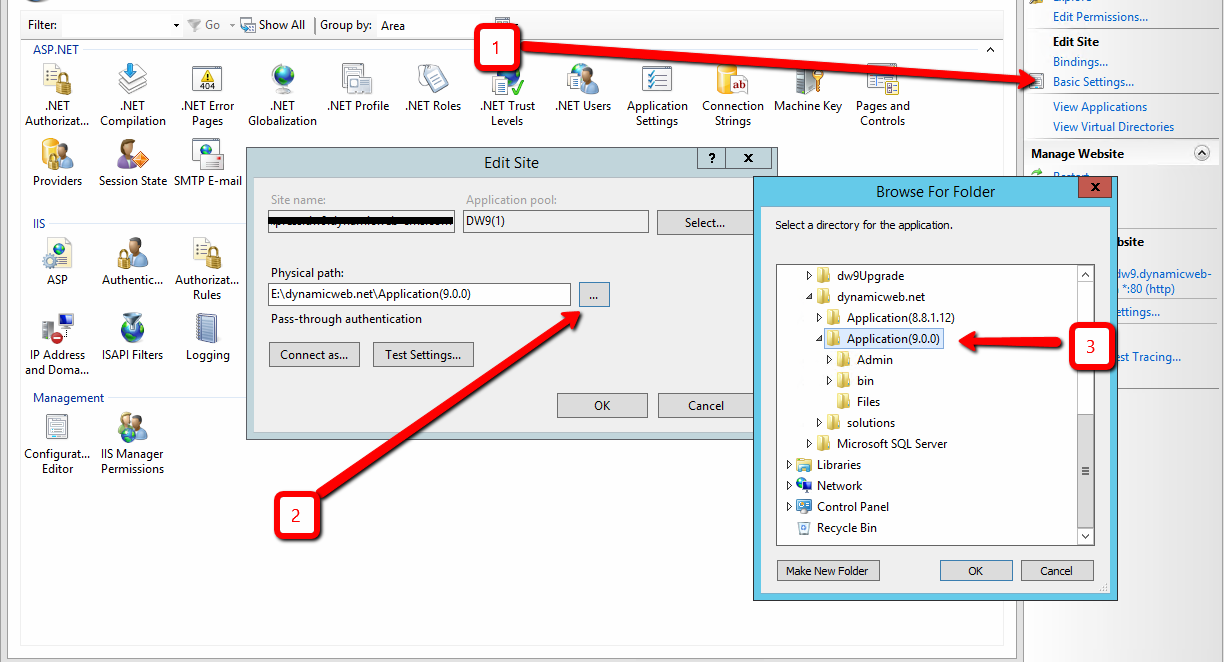 - Open IIS > Website > Open Actions > Basic Settings and switch to the DW9 application you downloaded